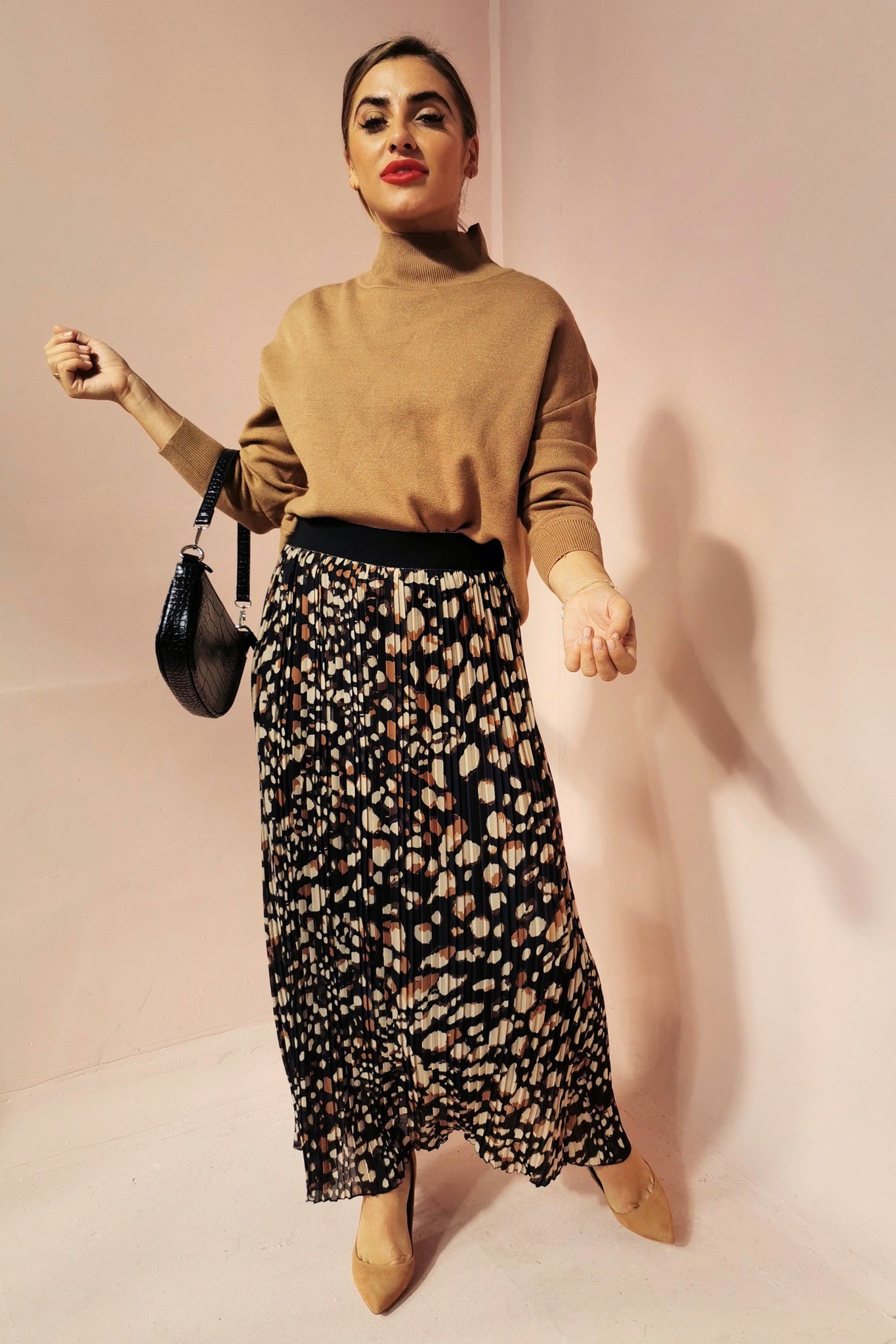 The Black Leopard Pleat Maxi Skirt is simply stunning. With a stretchy waistband and gorgeous animal print running throughout this skit is wardrobe staple everyone needs to have. Made with an elastic waist band which stretches to fit from size 8 to size 16, this skirt is super comfortable and flattering on all body types. Wear with our Camel High Neck jumper a heeled ankle boot and our Black Baguette bag to finish off the look.